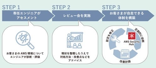 AWSが提供するクラウドセキュリティ体制管理サービス「AWS Security Hub」を用いて、お客様環境を診断。診断結果を「すぐに対処するべきリスク」「将来的に検討すべきリスク」など緊急度別に整理し、具体的な対処方法、改善策を提示します。エンジニアが直接質問を受け、疑問点や不明点を解消するほか、お客様の環境に合わせたベストプラクティス運用、設定に関するご提案なども行い、お客様が自社でセキュリティ運用できる体制構築を支援します。
