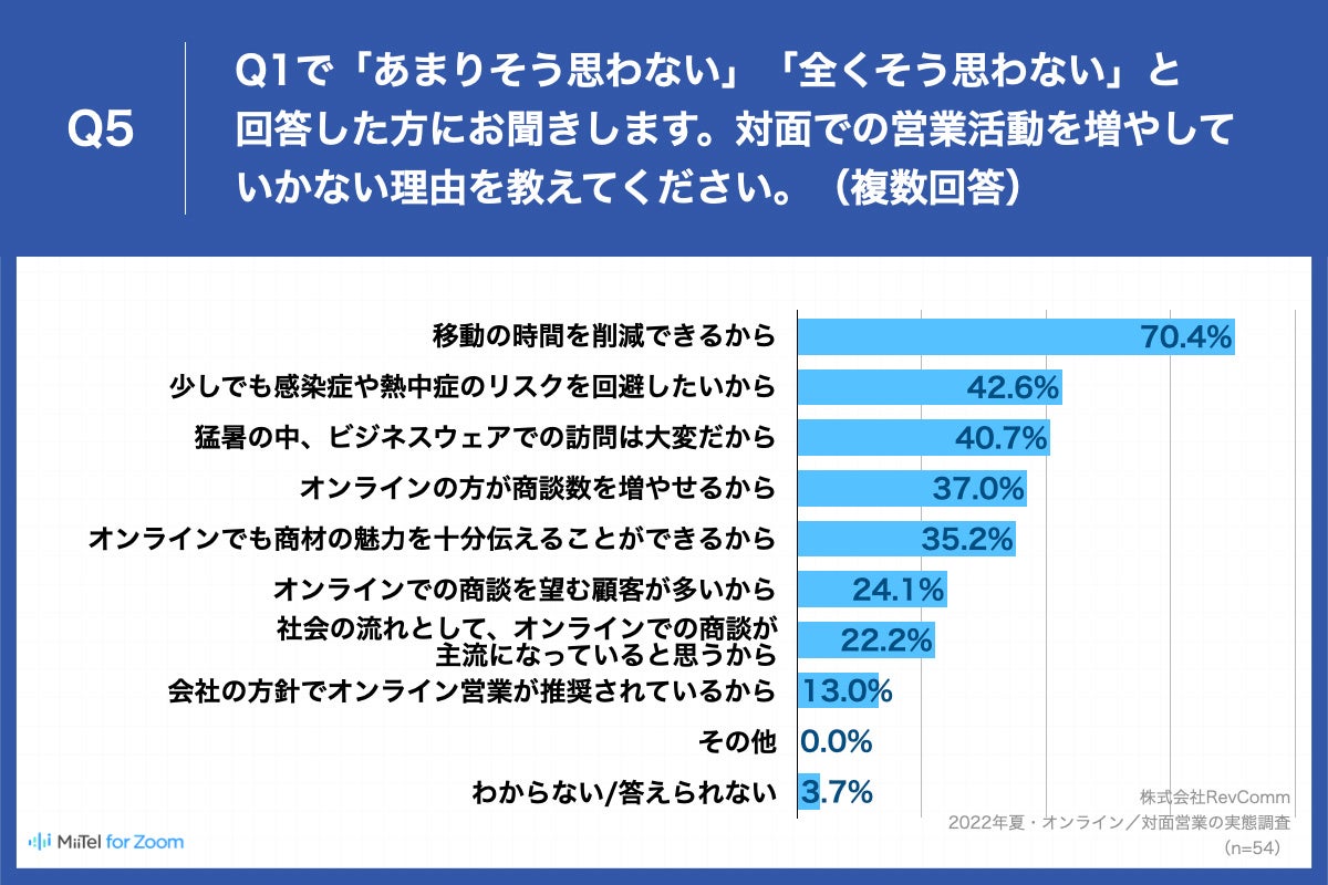 Q1で「あまりそう思わない」「全くそう思わない」と回答した方に、「Q5.対面での営業活動を増やしていかない理由を教えてください。(複数回答)」(n=54)と質問したところ、「移動の時間を削減できるから」が70.4%、「少しでも感染症や熱中症のリスクを回避したいから」が42.6%、「猛暑の中、ビジネスウェアでの訪問は大変だから」が40.7%という回答となりました。