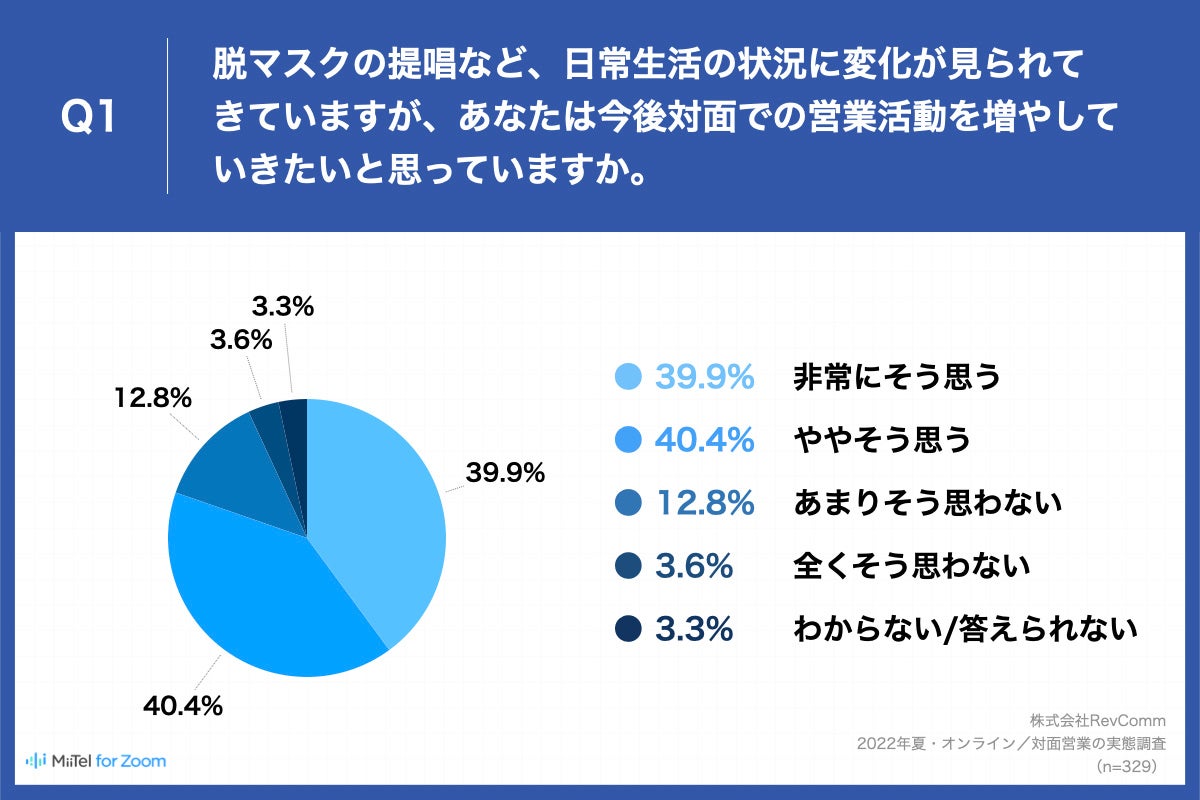 「Q1.脱マスクの提唱など、日常生活の状況に変化が見られてきていますが、あなたは今後対面での営業活動を増やしていきたいと思っていますか。」(n=329)と質問したところ、「非常にそう思う」が39.9%、「ややそう思う」が40.4%という回答となりました。(調査期間:2022年7月7日〜同年7月8日)