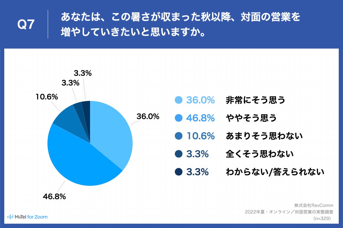 「Q7.あなたは、この暑さが収まった秋以降、対面の営業を増やしていきたいと思いますか。」(n=329)と質問したところ、「非常にそう思う」が36.0%、「ややそう思う」が46.8%という回答となりました。