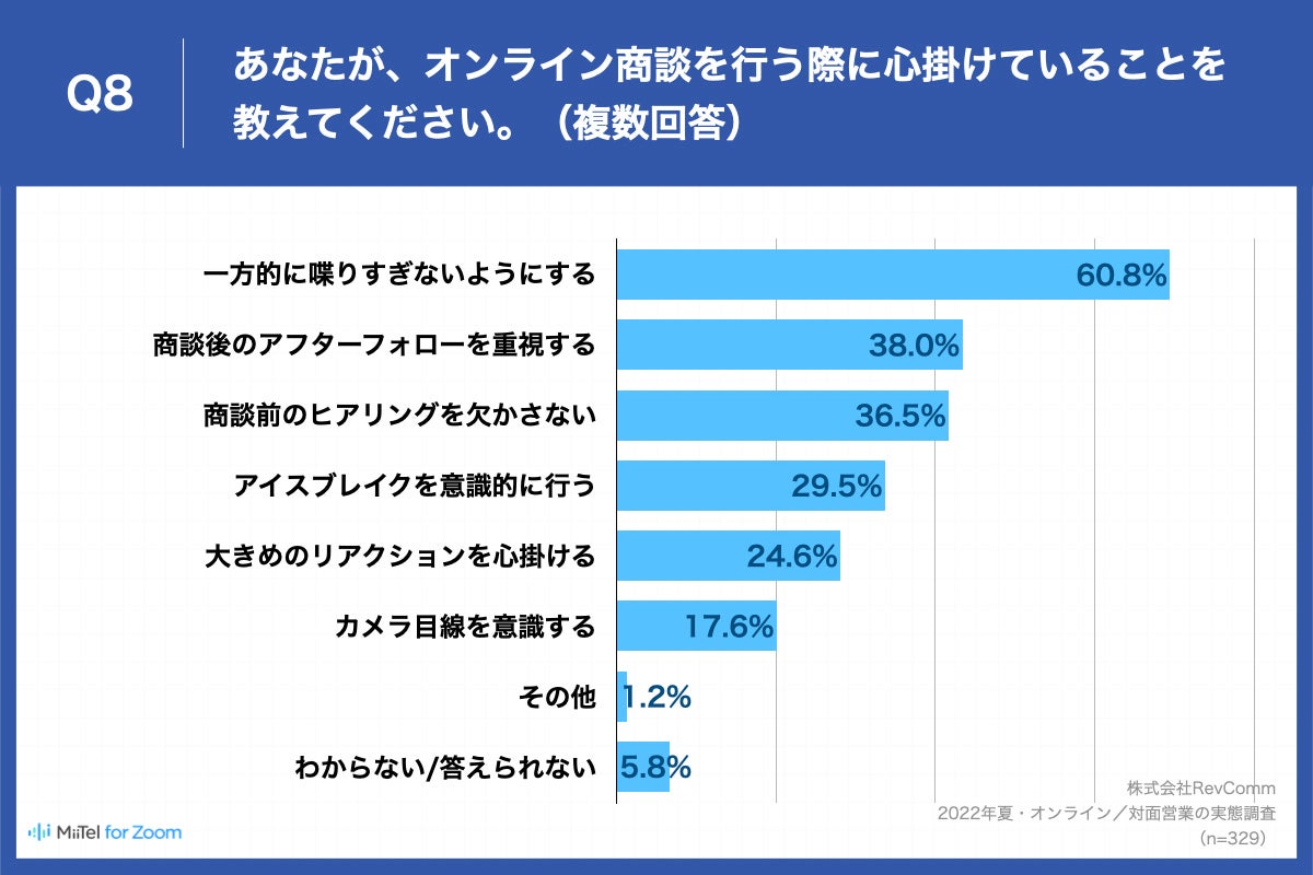 「Q8.あなたが、オンライン商談を行う際に心掛けていることを教えてください。(複数回答)」(n=329)と質問したところ、「一方的に喋りすぎないようにする」が60.8%、「商談後のアフターフォローを重視する」が38.0%、「商談前のヒアリングを欠かさない」が36.5%という回答となりました。