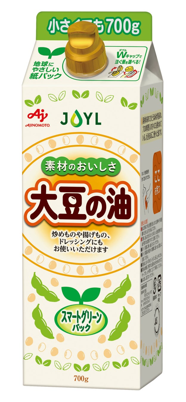 具体的取り組みとして、2021年8月に紙パックを採用した家庭用油脂商品 JOYL「AJINOMOTO 一番しぼりキャノーラ油」、JOYL「AJINOMOTO 純正ごま油」の2種類を発売いたしました。従来の同容量帯容器と比較してプラスチック使用量を約60%削減し、CO2は約26%以上の削減を見込んでいます(当社計算)。また、注ぎやすさや持ちやすさ、廃棄のしやすさ等も考慮して設計しており、地球環境だけではなく使用性にも配慮した商品ということでご好評いただいています。