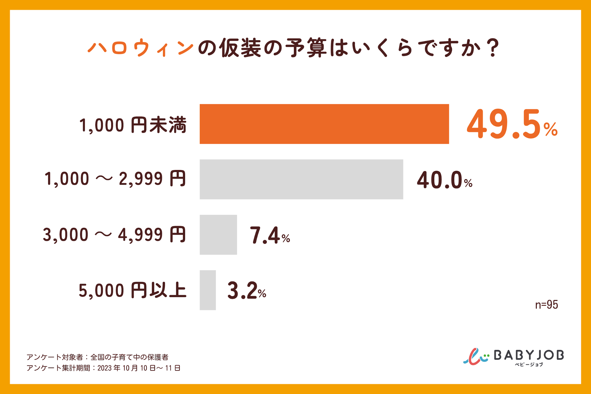 また、仮装に使う予算は、1,000円未満と答えた保護者が49.5%にも上り、全体の約9割の保護者が3,000円未満で仮装することを予定していることがわかりました。