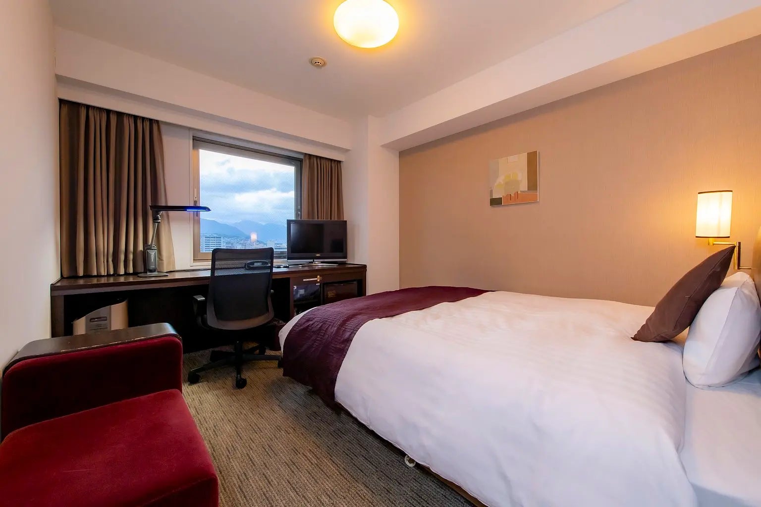 JR大分駅より徒歩10分。市街地に位置しアクセス抜群です。観光とビジネスの拠点としてご利用ください。広々とした18㎡の客室に154㎝のワイドベッドを設置。広めのデスクと明るい照明でテレワークにも最適です。