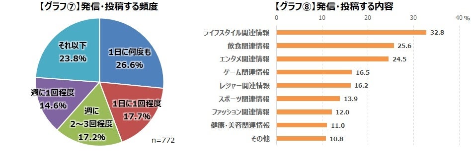 また、どのような内容を発信・投稿しているのかを聞いたところ、「ライフスタイル関連情報」や「飲食関連情報」「エンタメ関連情報」などが、「ゲーム関連情報」16.5%よりも高い結果となっています。【グラフ⑧】