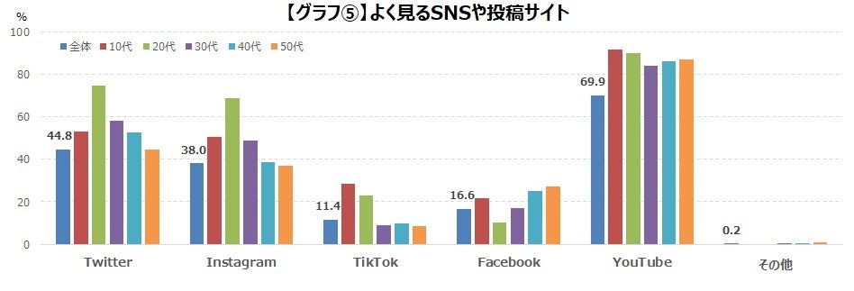「YouTube」はどの年代でも利用率が高かったのですが、20代は他の年代よりも「Twitter」「Instagram」の利用が高く、10代は「TikTok」の利用率が他の年代よりも高い結果となっています。【グラフ⑤】