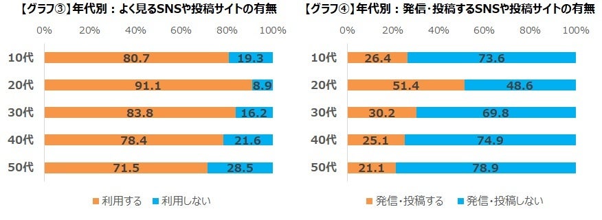 SNSや投稿サイトの利用については、年代でそれほど大きな差は見られませんでしたが、発信・投稿するのは20代が非常に多いことがわかります。