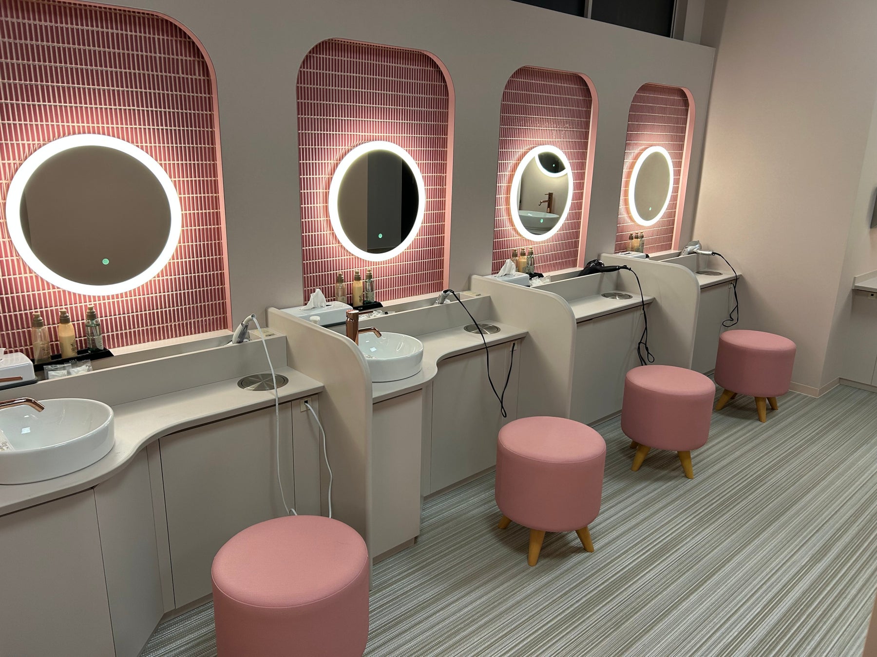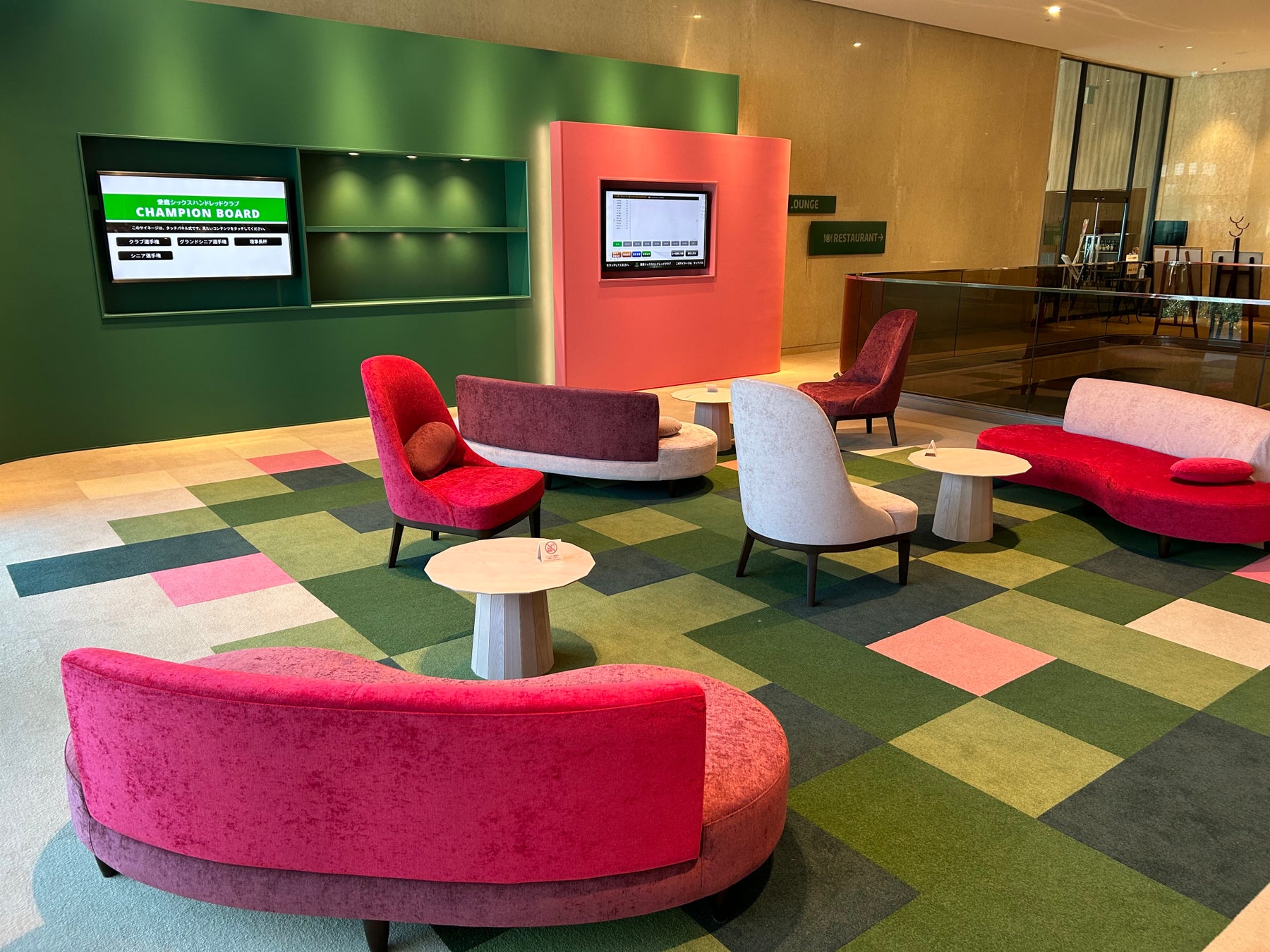 今回、開場55年の歴史を経て『カジュアル&クラシック』をコンセプトに、クラブハウス内外を全面的に刷新しました。テーマカラーには、愛鷹山原産の植物「アシタカツツジ」のピンクと、鮮やかなグリーンを採用。カジュアルさを演出することで、大理石を基調とした従来のクラシックなクラブハウスから、より温かく・親しみやすい空間へと生まれ変わりました。女性施設には新たにパウダールームを設置した他、ロッカールーム内のメイクアップコーナー、浴室内のシャワーブースやシャンプーバーも新設。さらに、2階ラウンジにはリラックススペースを設け、広々とした空間を最大限に活かし、プレー以外のお時間もより快適にご利用いただける環境を整えました。