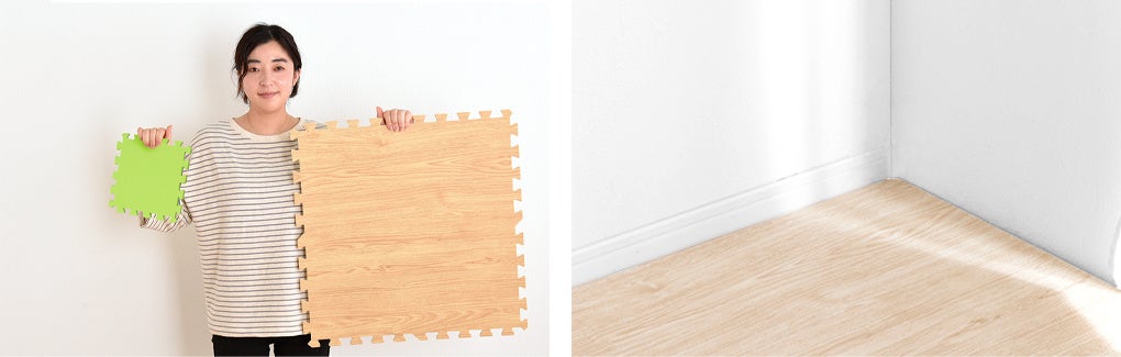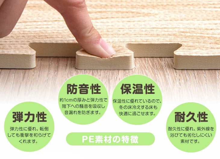 冬などの低温に環境でも硬くなりにくいPE素材を使用しています。適度な弾力性に優れているためお子様が転んだ際も衝撃を和らげることができ、おもちゃなどによるフローリングへのキズ対策としてもご使用いただけます。