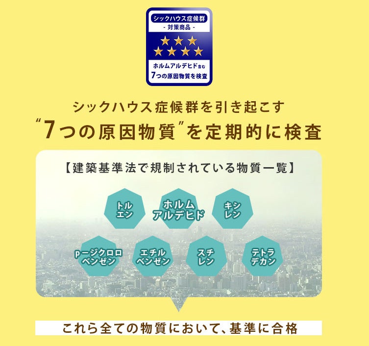 シックハウス対策として建築基準法で規制されている7種類の物質(ホルムアルデヒド、トルエン、キシレンD-自クロロベンゼン、エチルベンゼン、スチレン、テトラデカン)の検査を自主的に行い、それらすべての厳しい品質検査をクリアしており、確かな安全性を保証しています。