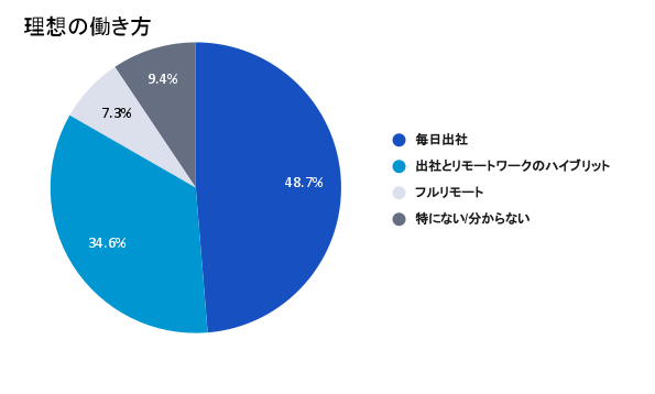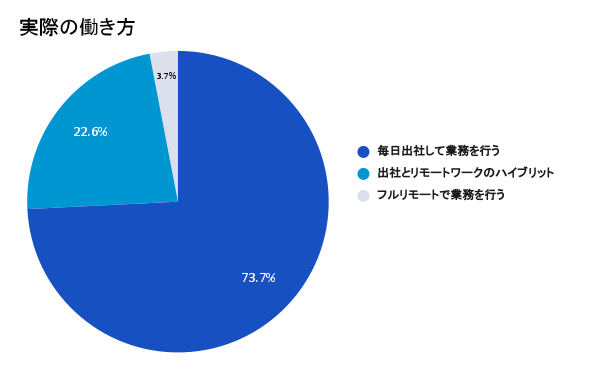 1)まず、現在の働き方を聞いたところ、毎日出社が73.7%、ハイブリットワークが22.6%、フルリモートが3.7%と回答。毎日出社する割合が突出して高い結果となった。