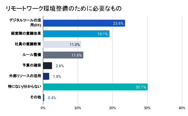 5)リモートワークを実施しやすい環境整備のために最も必要なものは何か聞いたところ、23.6%がデジタルツールの活用(DX)と回答。次いで、経営陣の意識改革が19.1%、ルール整備が11.6%となった。