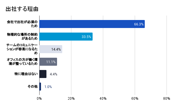 3)2)の設問で、定期的に出社をしていると回答した人を対象に、出社理由を確認したところ、「会社で出社必須のため」と回答した割合が66.3%、次いで、情報セキュリティ観点や現場作業など「物理的な場所の制約があるため」と回答した割合は33.5%、「チームのコミュニケーションが容易になるため」と回答したのが14.4%となった。