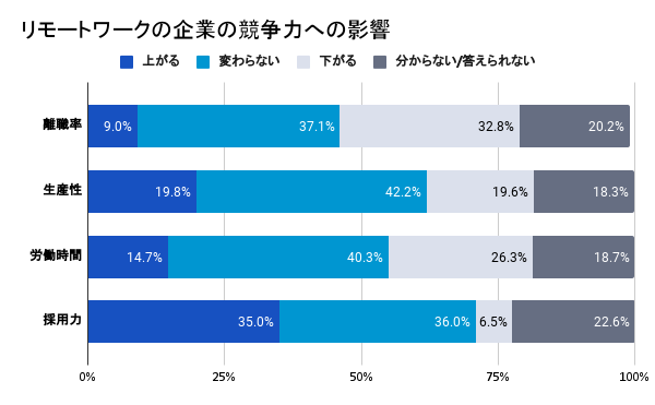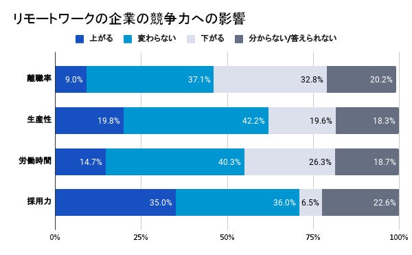 「リモートワーク可能」の場合、離職率は下がり、採用力は上がると3割強が回答