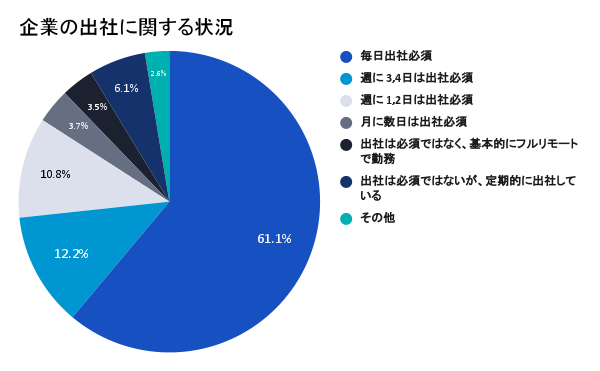2)次に、会社によってどの程度出社の必要性があるか確認したところ、毎日出社が必須と答えた割合は61.1%と圧倒的に多く、次いで、週の半数である3、4日の出社が必須と答えた割合が12.2%、次いで週に1、2日の出社が必要であると10.8%が回答。