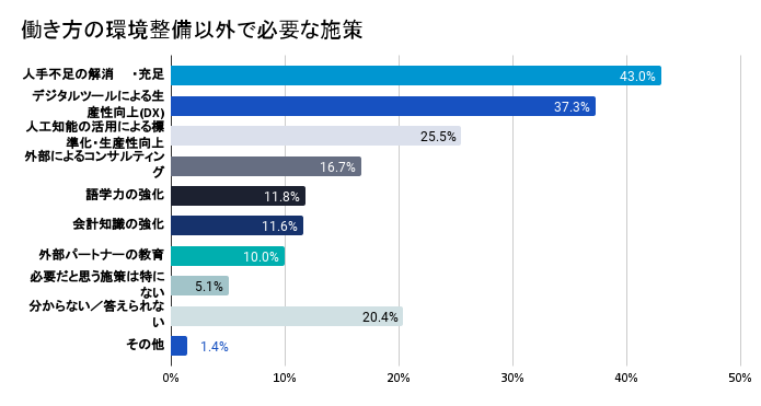 7)働き方の環境整備以外で、必要だと思う施策を聞いたところ、「人手不足の解消・充足」が43.0%で1位、次いで「DXによる生産性向上」が37.3%、「AI活用による標準化・生産性向上」が25.5%となった。製造業においては慢性的な人手不足が課題となっているが、DXやAIといった技術の活用が上位となった。