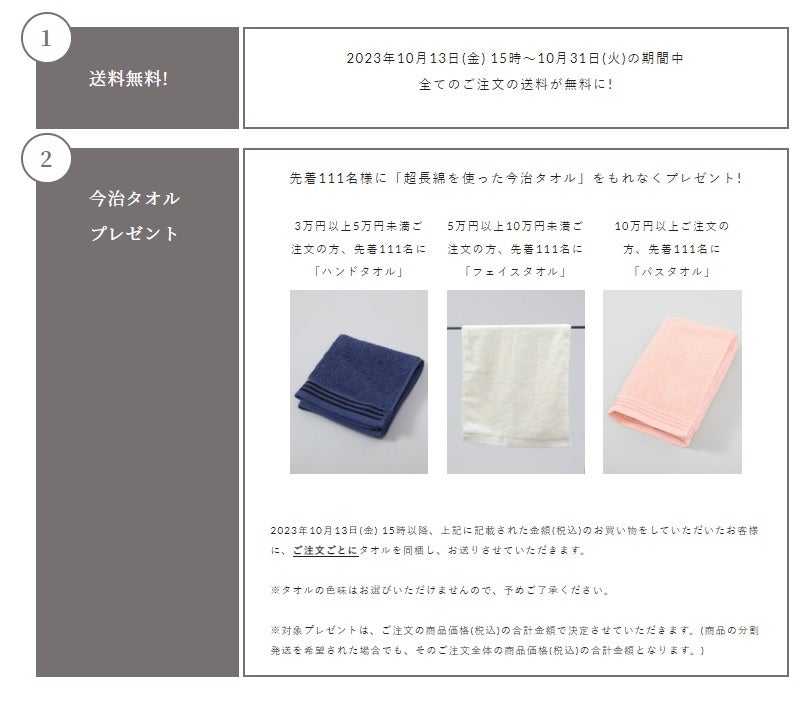 2023年10月13日(金) 15時以降、上記に記載された金額(税込)のお買い物をしていただいたお客様に、ご注文ごとにタオルを同梱し、お送りさせていただきます。
