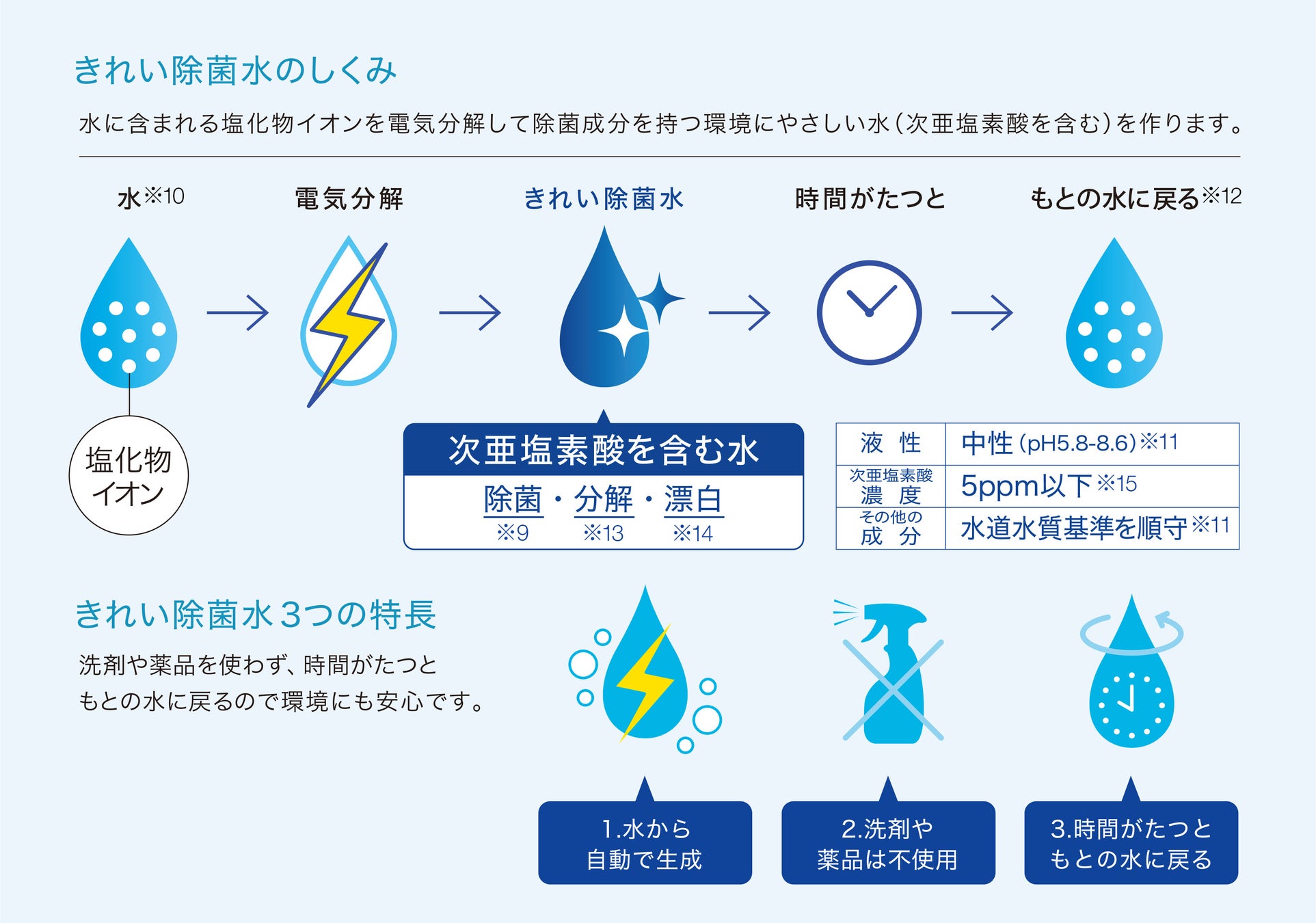 きれい除菌水[※9]は、水[※10]に含まれる塩化物イオンを電気分解して作られる除菌成分(次亜塩素酸)を含む水です。薬品や洗剤を使わず、水から作られます。きれい除菌水は安全性の観点から水道水質基準[※11]の範囲内の濃度で作られており、安全[※12]で、さらに時間がたつともとの水に戻る[※13]ので環境にやさしいのが特長です。