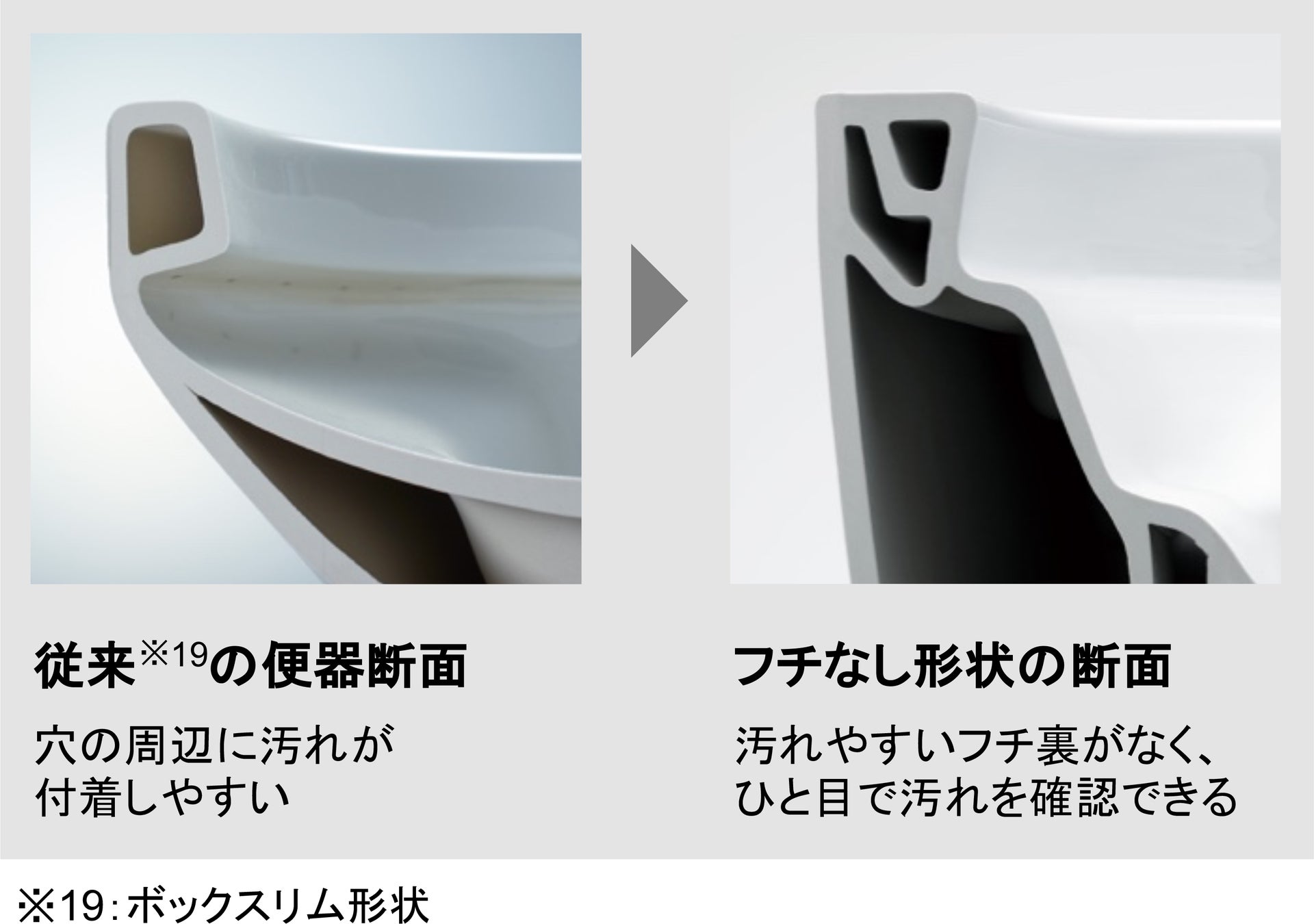 汚れのたまりやすいフチ裏をなくした独自開発の形状。手前から奥までぐるっとフチがないため、サッとひとふきで掃除がしやすいです。