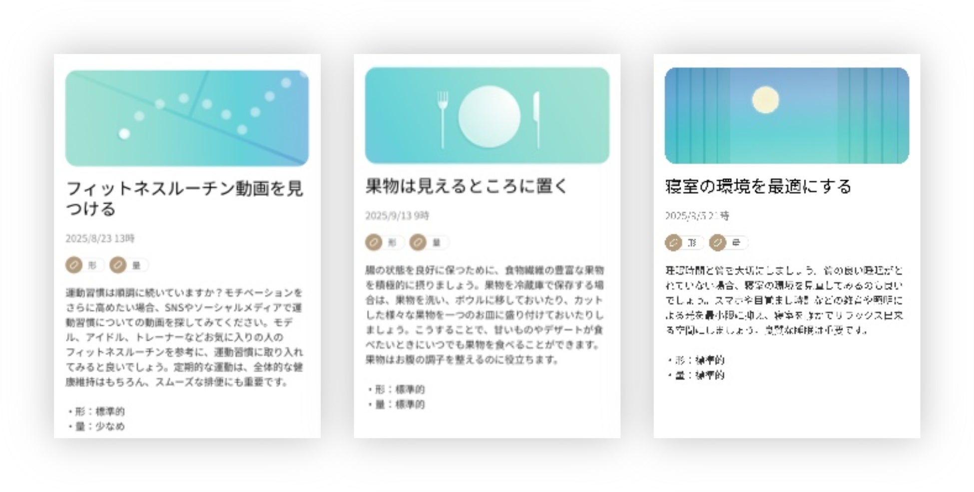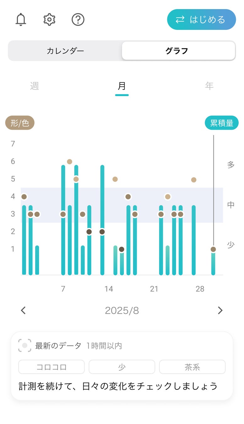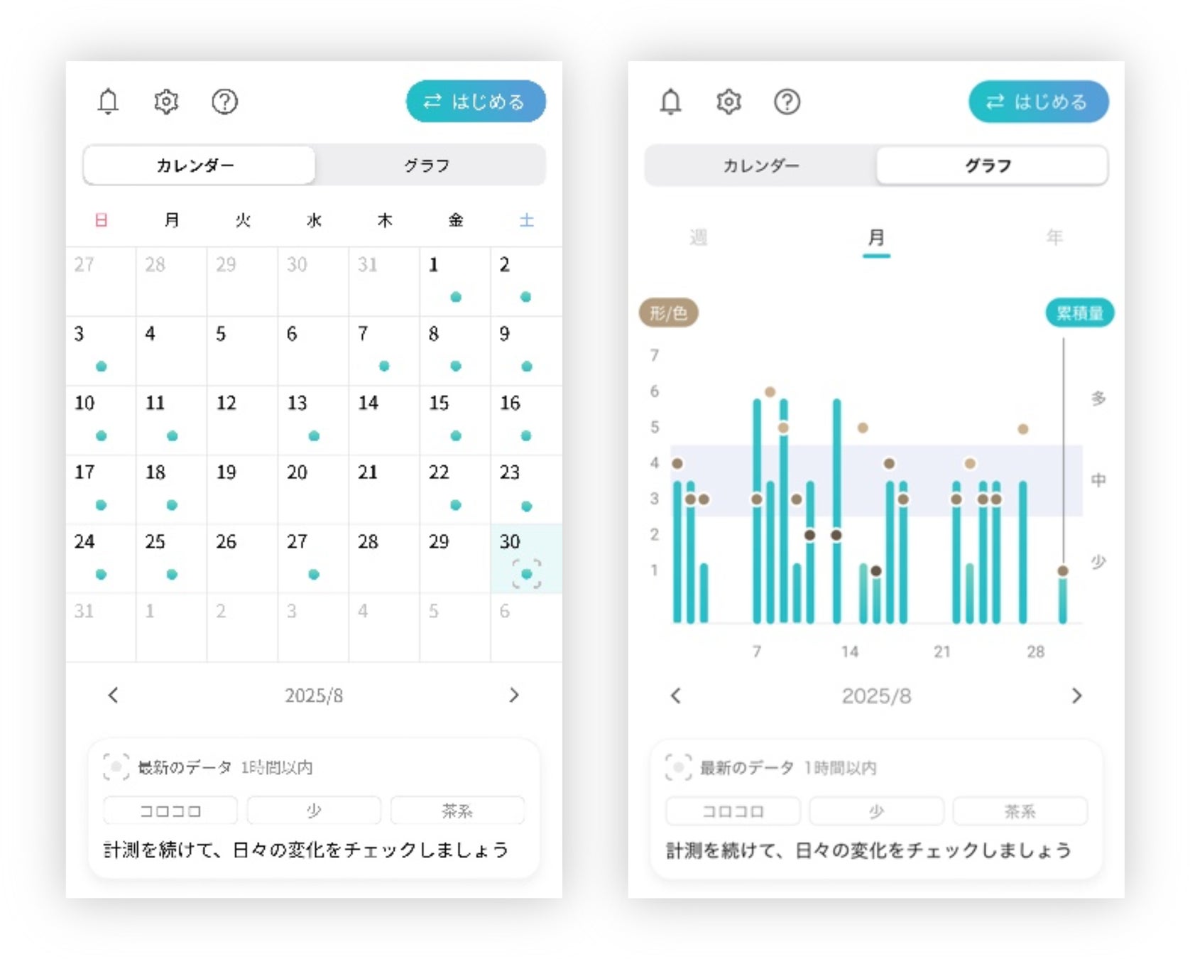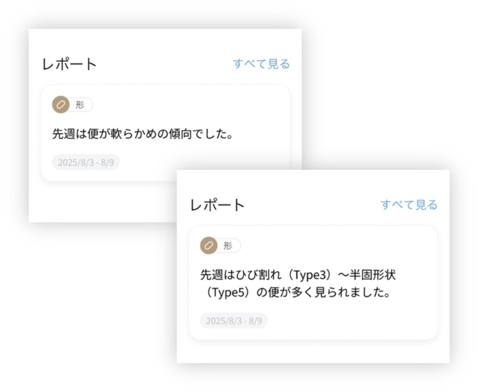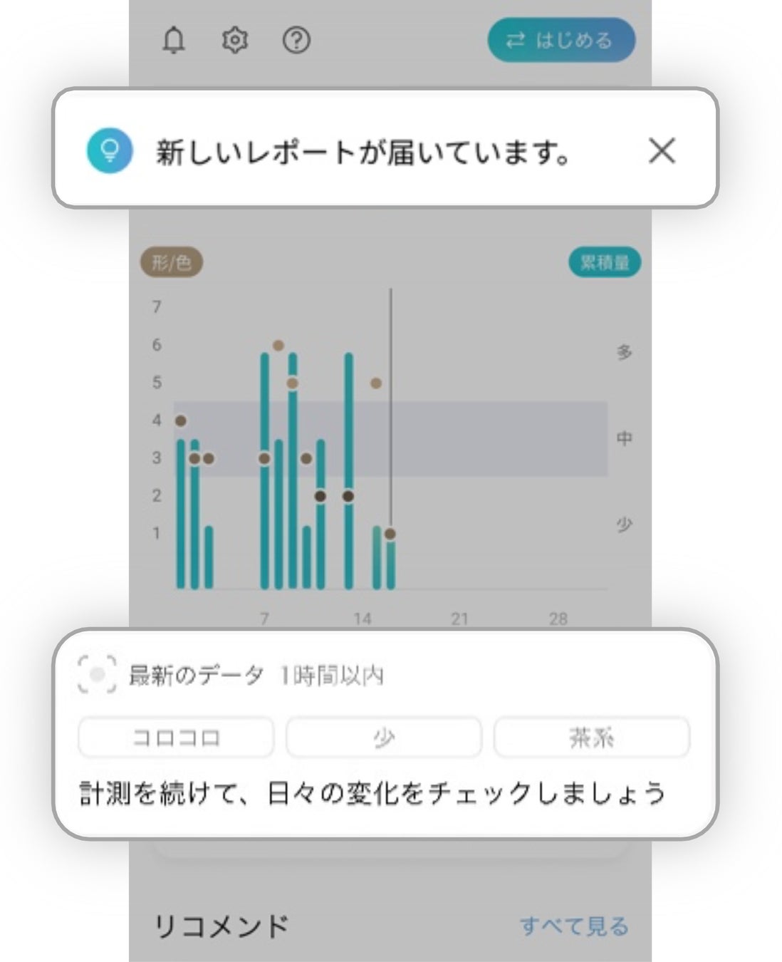 ・毎日の便の状態や傾向、その状態に合わせたリコメンドなどを表示