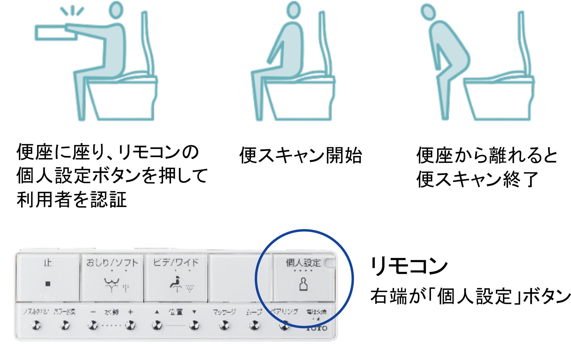 その後は、トイレに入って便座に座り、リモコンの「個人設定」ボタンを押して使用者を認証するだけ[※4]。便スキャンが自動的に開始され、便座から立ち上がると便スキャンが終了します。