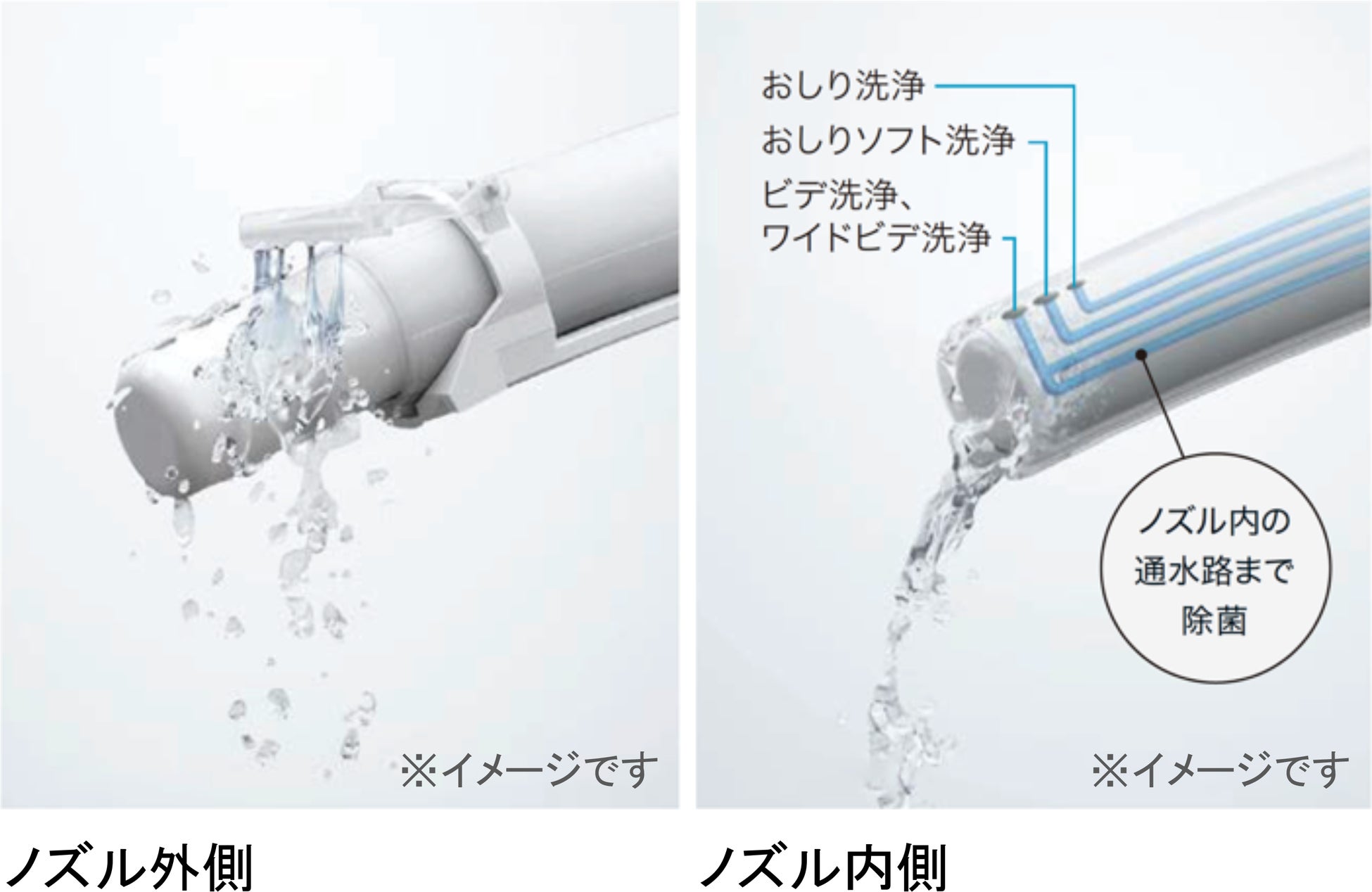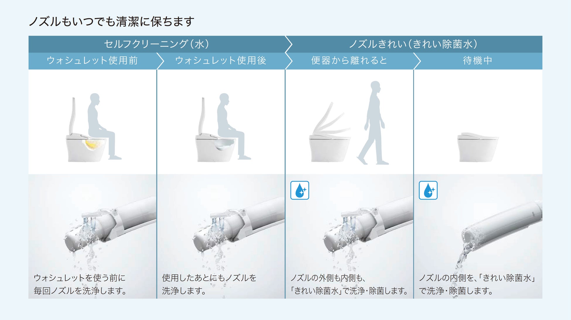 「ウォシュレット」使用前後に水でノズルを洗浄する「セルフクリーニング」に加え、トイレ使用後に「きれい除菌水」が、ノズルの内側も外側も自動で洗浄・除菌[※16]。8時間使用していない待機中にも定期的に洗浄することで、ノズルのきれいが長持ちします。