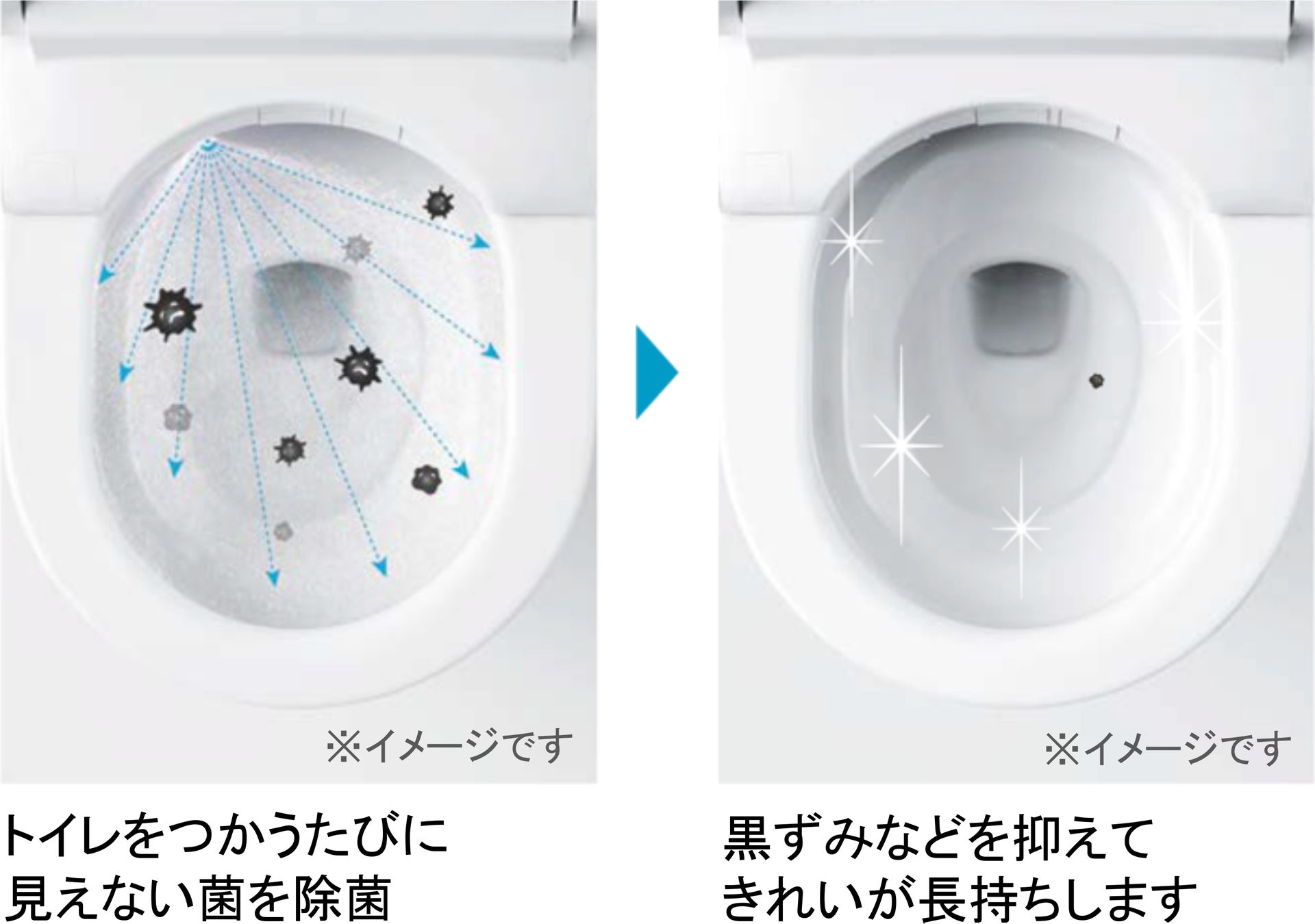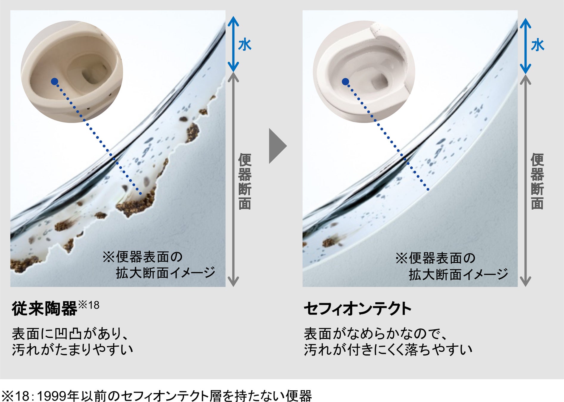 ※16:除菌効果は試験機関による実験結果であり、実使用の実証結果ではありません。すべての菌を除菌できるわけではありません。汚れを抑制するもので、清掃不要になるものではありません ※17:除菌効果はフチなし形状、セフィオンテクト便器との組み合わせの場合