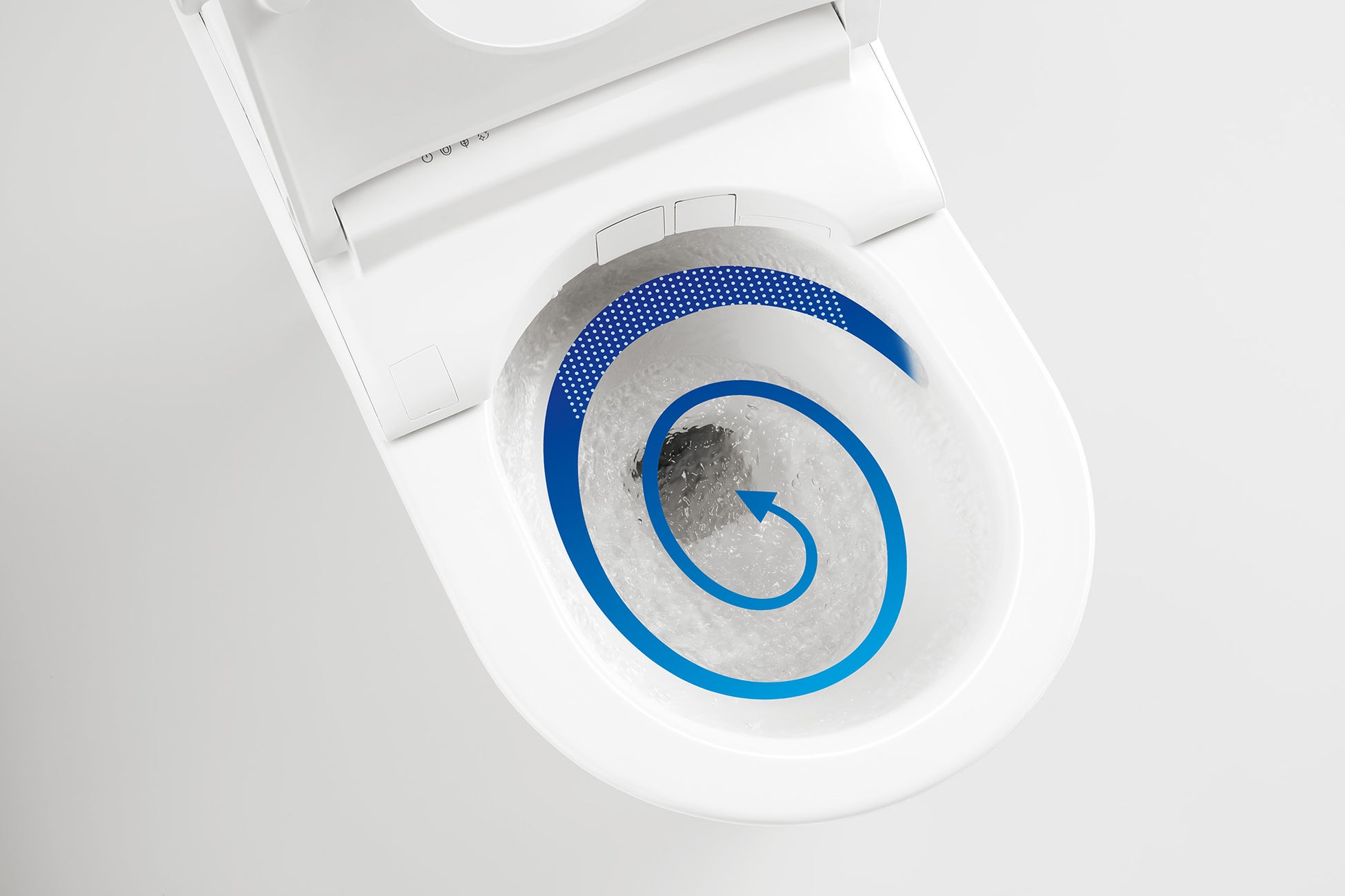 渦を巻くようなトルネード洗浄が、少ない水で効率的に洗浄します。汚物が付着しやすい便器後方に勢いよく水が当たるので、汚れをしっかり洗い流します。また便器正面から吐水口が見えないので、すっきりとした見た目を実現しています。