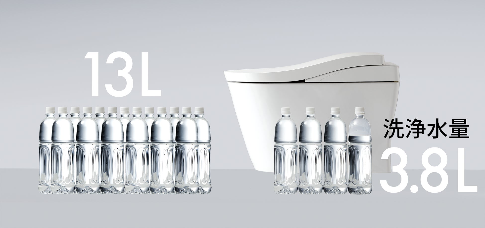 便器の洗浄水量は、大洗浄3.8L(床排水の場合)。従来の13L便器の約3分の1、8L便器の約2分の1と、大幅な節水を実現しています。