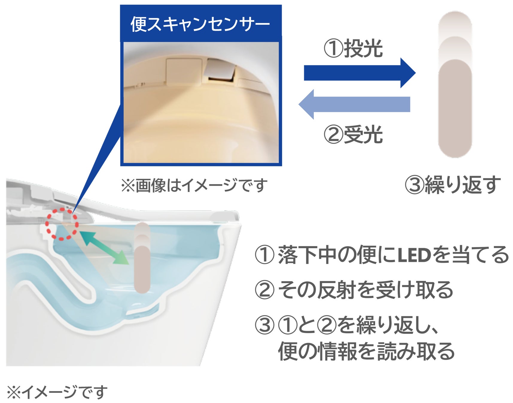 ・ウォシュレットに内蔵した便スキャンセンサーで落下中の便をスキャンし、便の形(硬さ)・色・量を自動計測