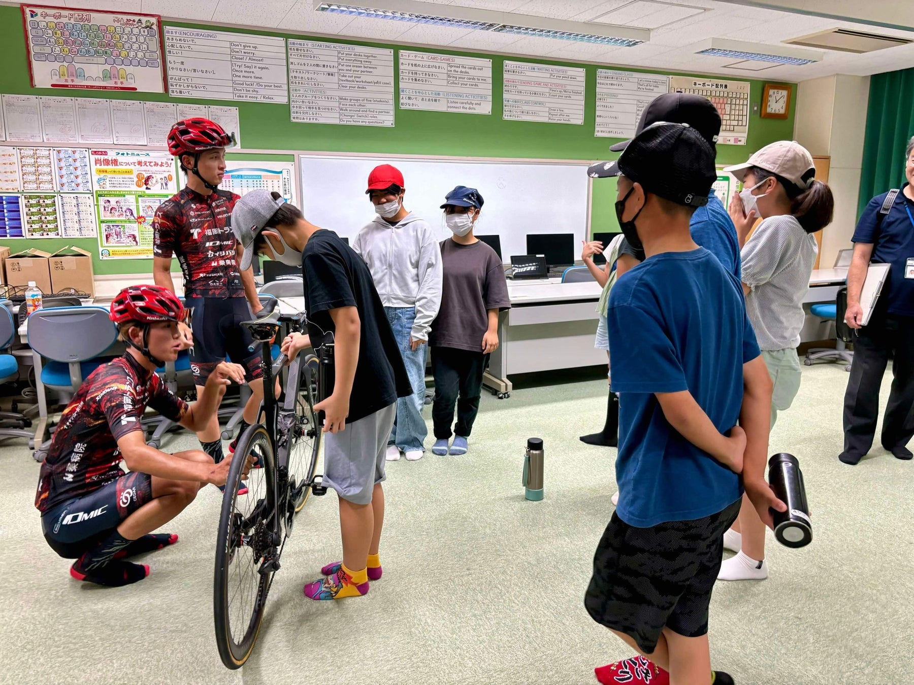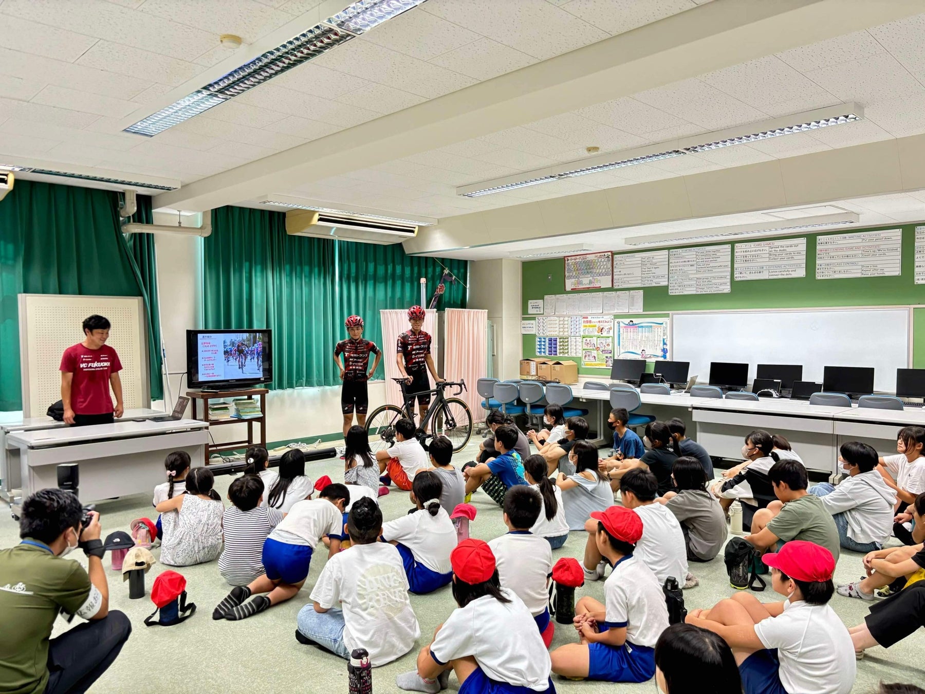 まずは教室で自転車の交通ルールを教えたり、VC FUKUOKAのチーム活動を伝える座学の時間を児童と一緒に過ごしました。