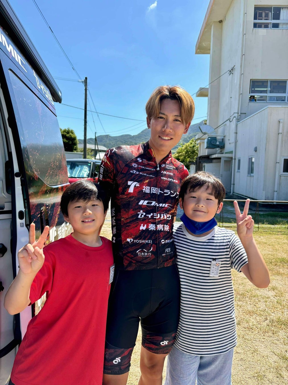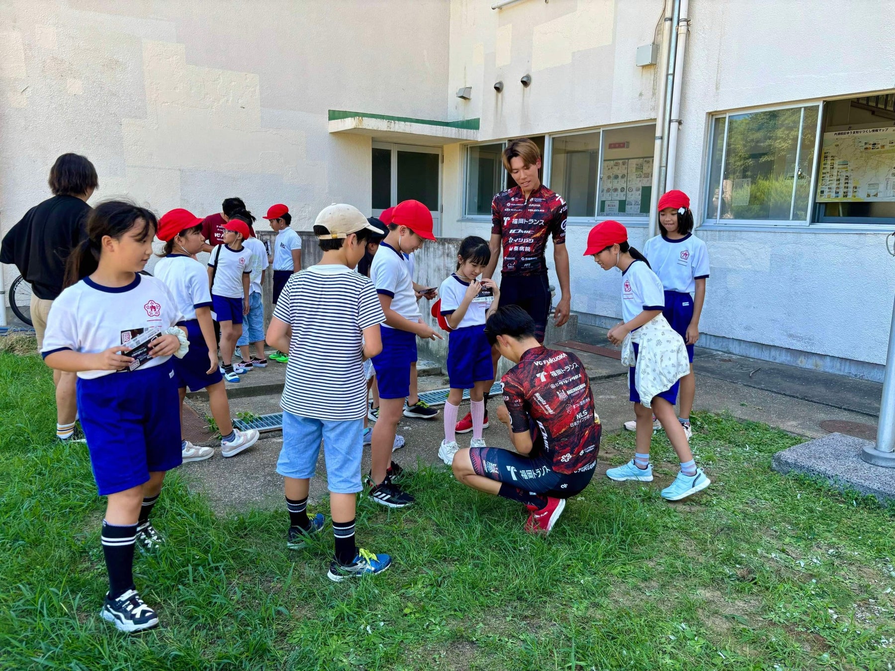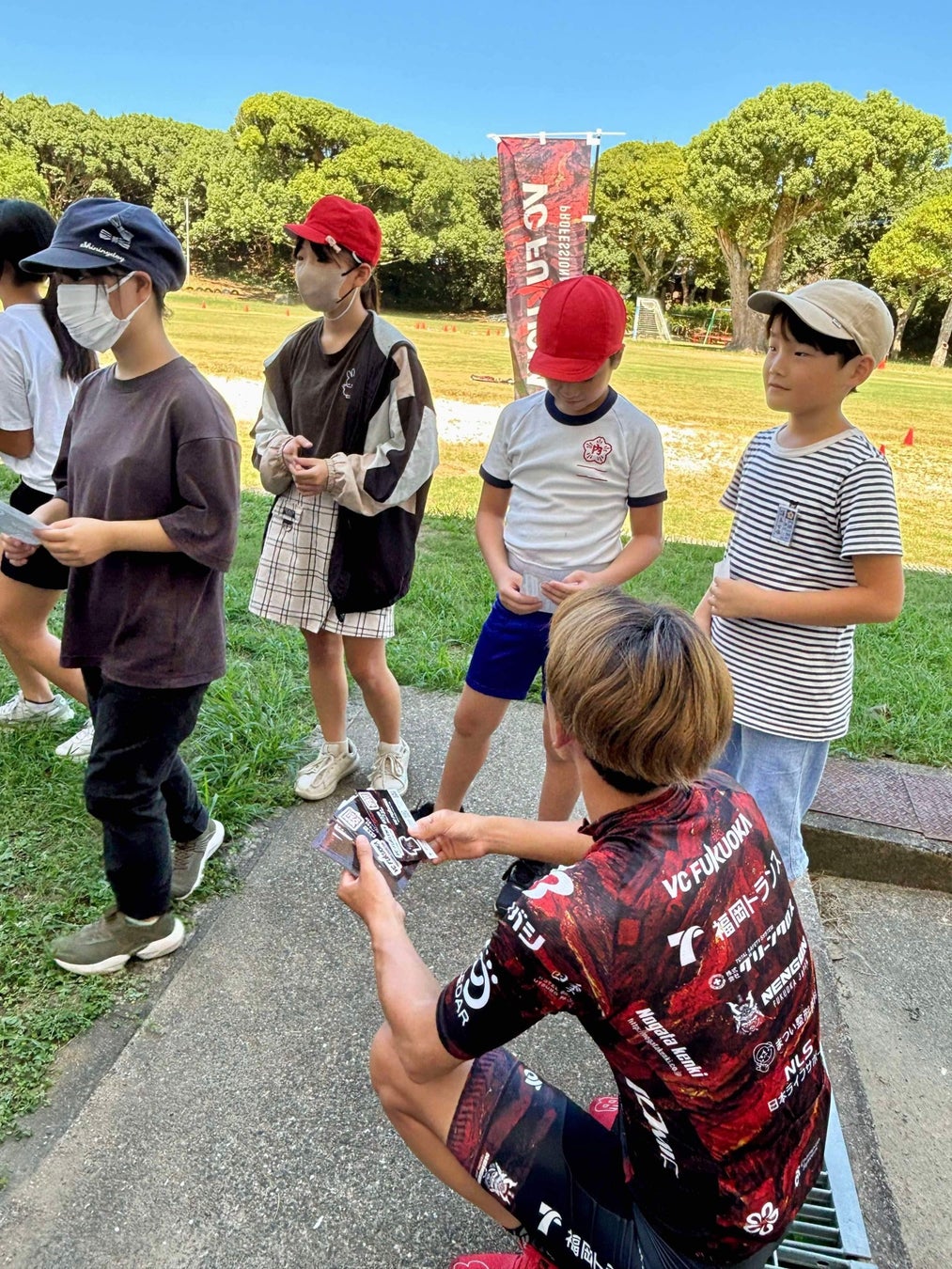 児童の皆さん、先生方、マイナビ ツール・ド・九州2024の当日は、VC FUKUOKAの赤いTシャツを着て、ぜひ応援に来てください!