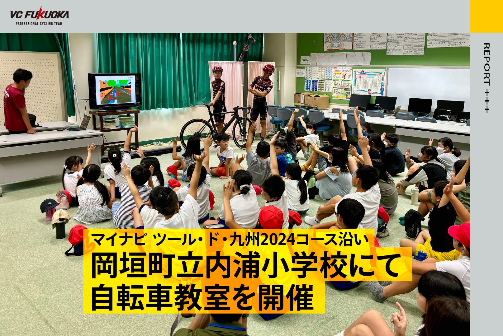 2024年9月17日に岡垣町立内浦小学校にて、自転車教室を開催しました。岡垣町は2024年10月14日に開催されるマイナビ ツール・ド・九州2024福岡ステージのコースとなっており、地元を舞台にした大会の魅力を伝えるPRも行いました。
