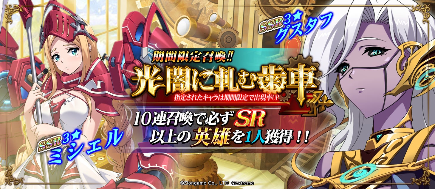 『光闇に軋む歯車』は10連召喚で必ずSR以上の英雄を一人獲得できる、期間限定召喚です。SSRグスタフ、SSRミシェルの出現確率が期間限定でアップします。