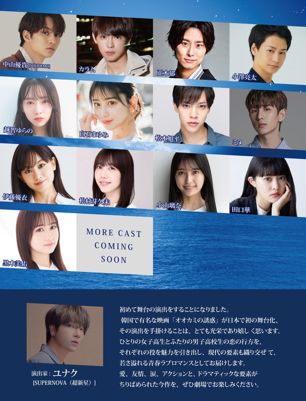 来る7月23日(土)~7月31日(日)銀座博品館劇場にて上演されるこの作品は、ユナク(SUPERNOVA(超新星))が初の演出を手掛ける。ユナク自身も日韓で数多くの舞台やミュージカル、ドラマ、映画に出演するなど多岐にわたり活躍しているマルチプレイヤーで、今回の韓国作品を日本での舞台化の演出として、どんな色を付けてくれるのかがとても楽しみです。初めての演出が決まったユナクは、『韓国で有名な映画「オオカミの誘惑」が日本で初の舞台化、その演出を手掛けることは、とても光栄であり嬉しく思います。それぞれの役の魅力を引き出し、若さ溢れる青春ラブロマンスをお届けします』と意気込みを語りました。