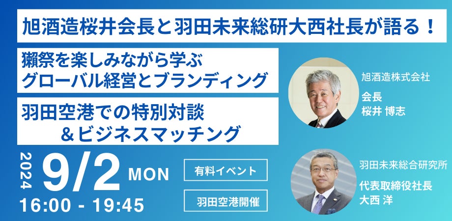 羽田未来総合研究所は、羽田空港を中心に「地方創生」・「観光開発」・「アート&カルチャー」・「コンサルティング」・「情報戦略」などの事業を展開し、新たなビジネスや価値の創出に挑戦しています。今回はその一環として、国内外で注目を集める日本酒「獺祭」の製造元、旭酒造株式会社会長桜井博志氏を招き、特別対談と交流会を開催することで、獺祭のグローバル経営やブランディングについて学べる貴重な機会を提供いたします。