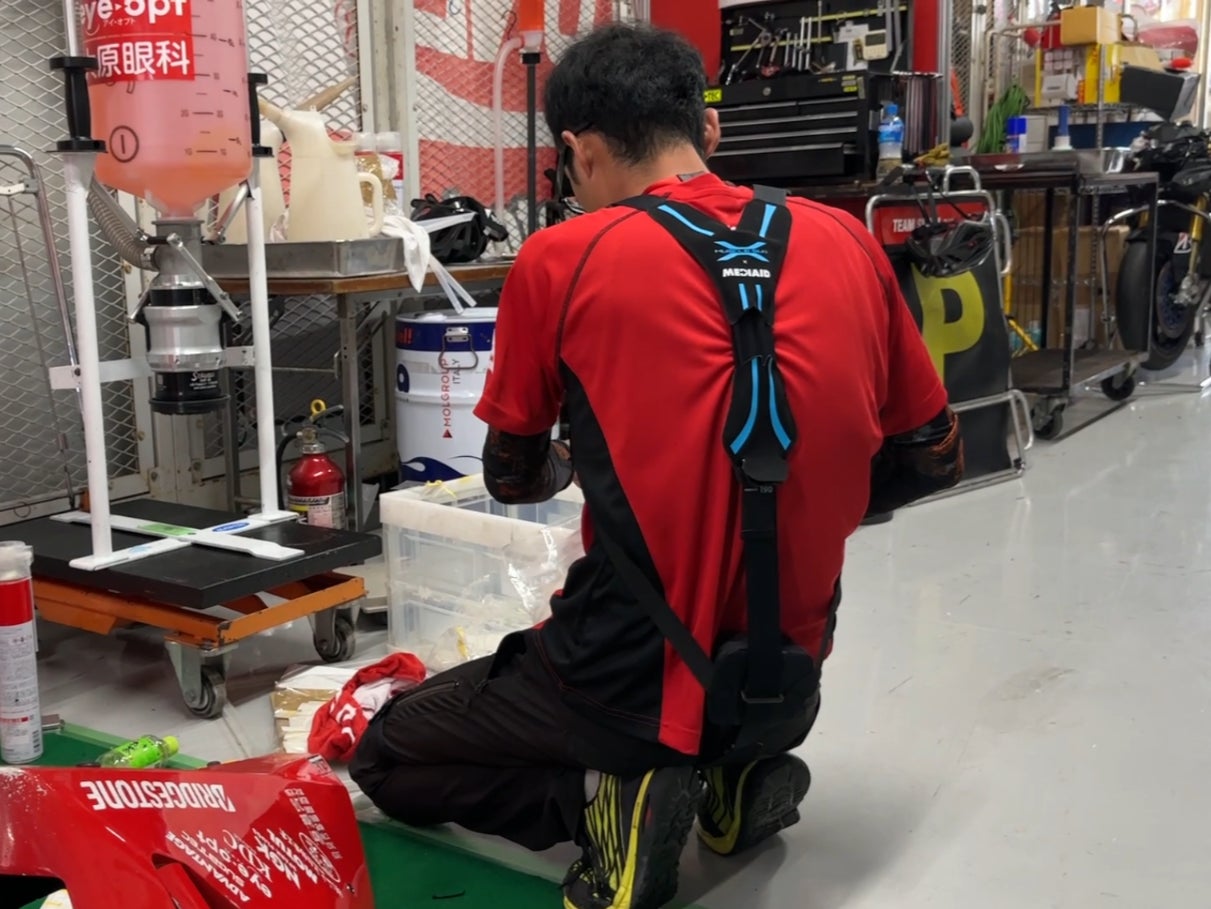 【メカニック担当者】オートバイのメンテナンスは同じ姿勢で長い時間作業する必要が有りますが、マッスルスーツのおかげで腰への負担が軽減され助かりました。