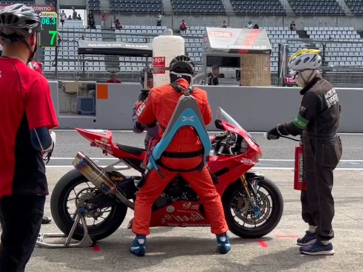 ガソリンチャージは約 30 ㎏のガソリンをバイクのタンク上部に持ち上げ、ピット作業の最後まで支える必要のある負担の大きい作業です。業界では若くて力のある男性がやる風潮がありますが、今後は老若男女問わず楽しめるモータースポーツであるために、こういった風潮も出来る限り少なくしていく必要があると考えています。アシストスーツを使うことで、若くて力のある人しかチームに参加できないという不平等感を無くしていけると感じます。バイクレースの世界大会の現場でアシストスーツが使われることは極めて異例。そのため、マッスルスーツを使ってよいかどうか、レース前の車検も通して主催者へも確認もいたしました。大会側も今後こういったものが必要だと理解を示し、使用許可が下りました。これから、モータースポーツの世界でもアシストスーツが浸透し、誰もが活躍し、楽しめるスポーツになってくれることを期待します。