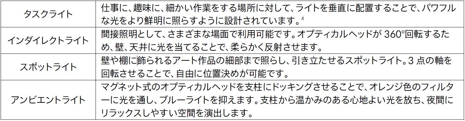 *³ 弱い光量:Illuminating Engineering Society(照明工学協会: IES)著 『The Lighting Handbook, Tenth Edition: Reference and Application』 (2011年7月30日)。 グレア: Sheedy JE, Hayes J and Engle J 著 「Is All Asthenopia the Same?」 『Optometry and Vision Science』 80 (11): p.732-739(2003) / フリッカー: IEEE 1789-2015規格「健康リスクを軽減するための高輝度LEDの変調電流の推奨慣行」に準拠した試験。