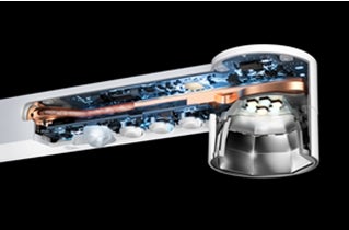 LEDは過熱すると、劣化や変色することがあります。ダイソンのエンジニアたちは、人工衛星でよく利用される技術を採用し、この問題を解決しました。この技術は、真空の銅管を用いて熱を逃がします。まず管内の一滴の水が気化し、その後、銅管の全長にわたって熱を放散させながら凝縮して液体に戻り、毛細管現象によって熱源へと戻り、循環します。これにより、エネルギー不要で止まることのない冷却サイクルが実現します。この冷却サイクルが 明るさと光の質が最長60年間保つことを可能にしました。*⁶