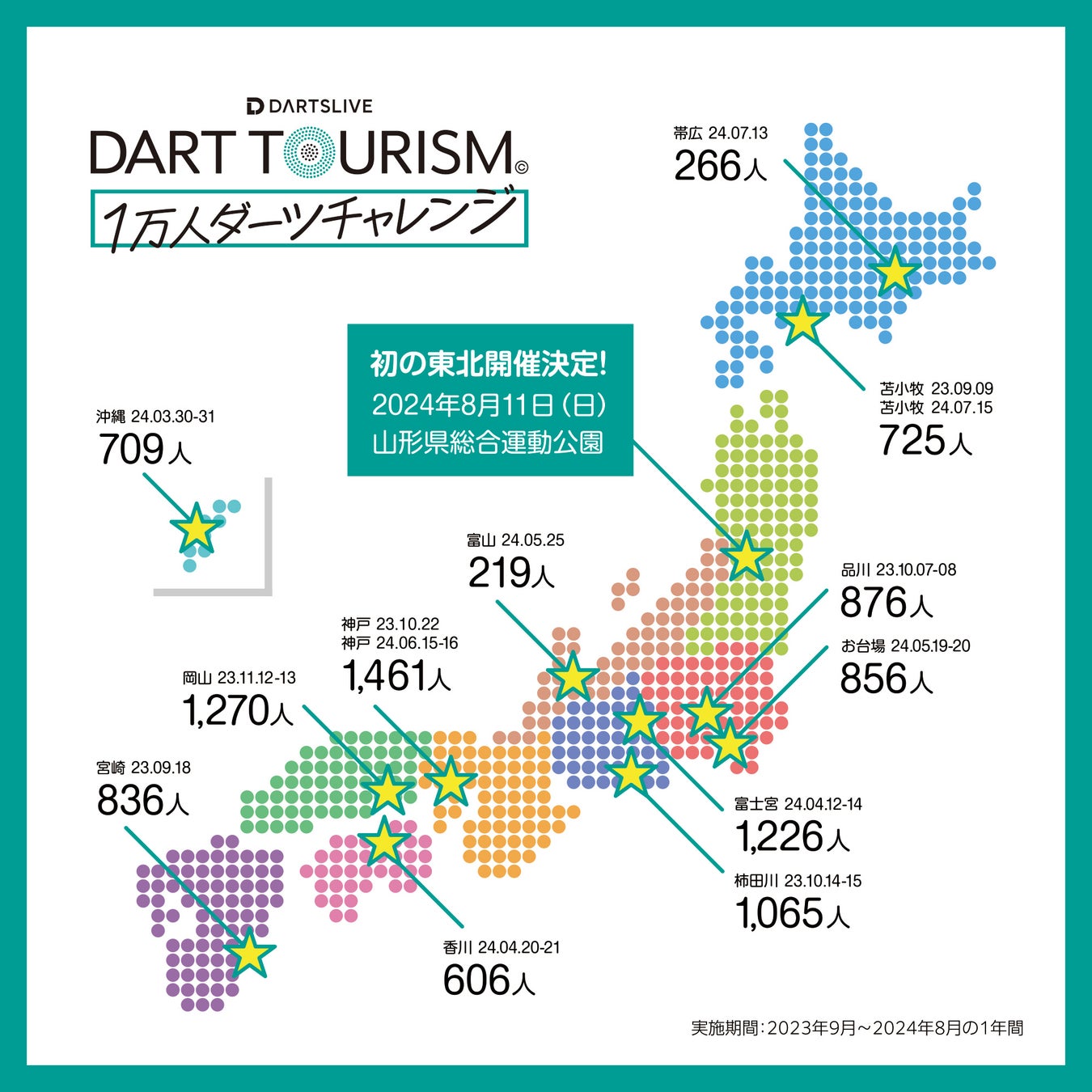 2023年9月9日からスタートした「1万人ダーツチャレンジ」では、日本全国のショッピングモールやイベント会場で子どもから大人まで幅広い人たちにダーツ体験を全国12カ所(イベント開催日数23日間)で実施。