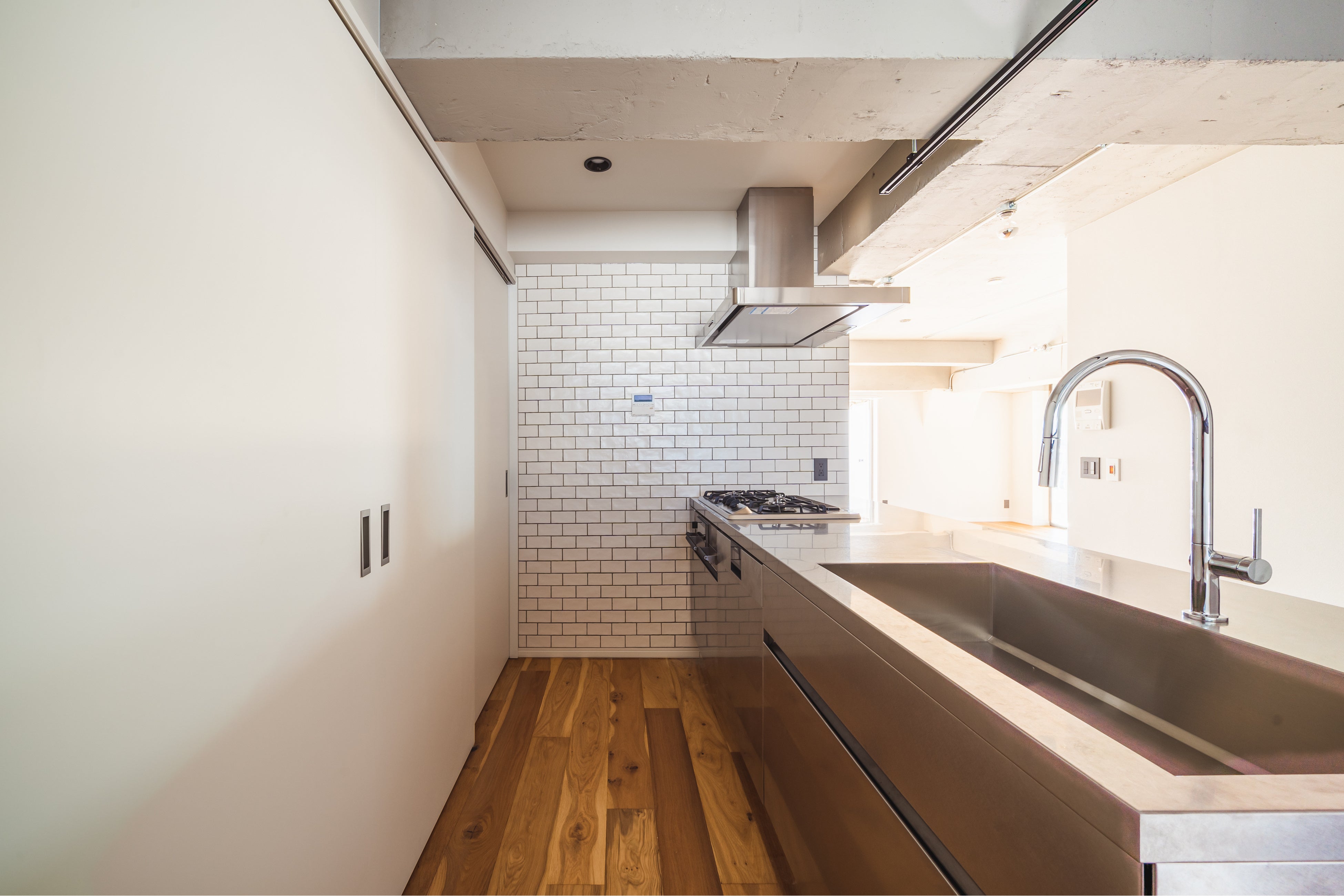 存在感のあるステンレスキッチン。壁面は白いタイル、天井はコンクリート現し