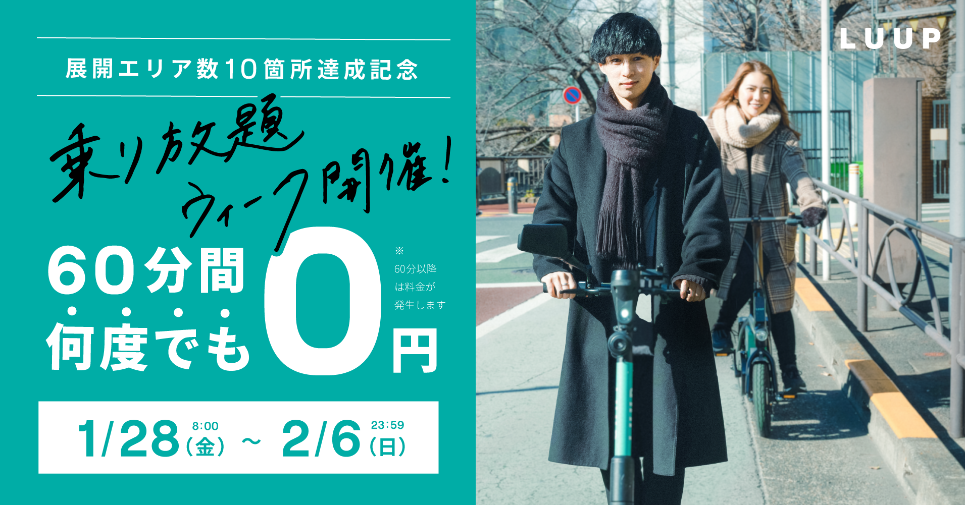 電動キックボードや小型電動アシスト自転車などの「電動マイクロモビリティ」を取り扱うシェアリングサービス「LUUP(ループ)」を展開する株式会社Luup(本社:東京都渋谷区、代表取締役社長兼CEO:岡井大輝、以下「Luup」)は、2022年1月28日(金)から2月6日(日)までの10日間、LUUPに60分間、何度でも無料で乗ることができる「乗り放題ウィーク」を開催します。また、本キャンペーンを電動キックボードの正しい走行ルールを周知する機会とすべく、主要ポートにてスタッフが交通ルールや利用方法などをまとめた「電動キックボードのご利用ガイドブック」の配布と乗り方のレクチャーを行います。