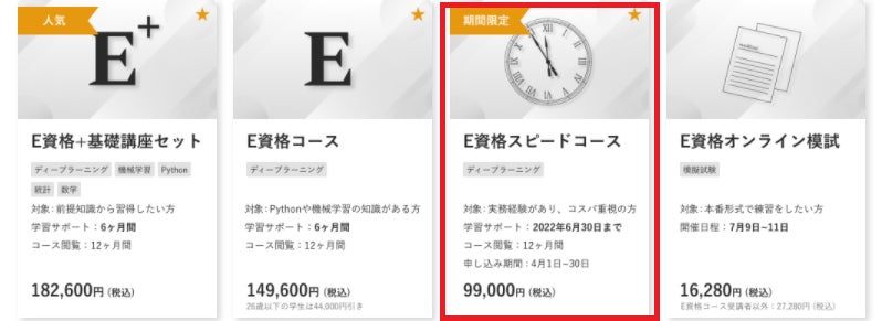 E資格2022#2に向けて「短期集中でJDLA認定プログラムを修了して、E資格に臨みたい」といったニーズにお応えし、「E資格直前突破スピードコース」を開講します。