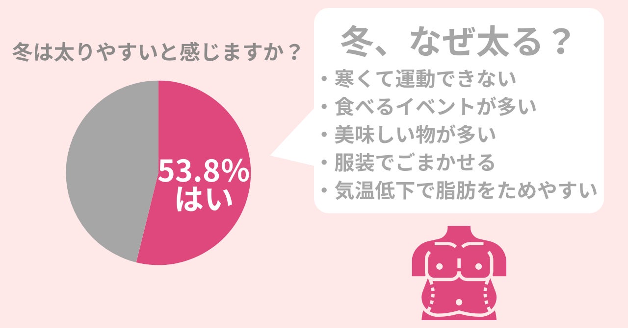 このような原因から、53.8%の女性が「冬は太りやすい」と感じるのかもしれません。