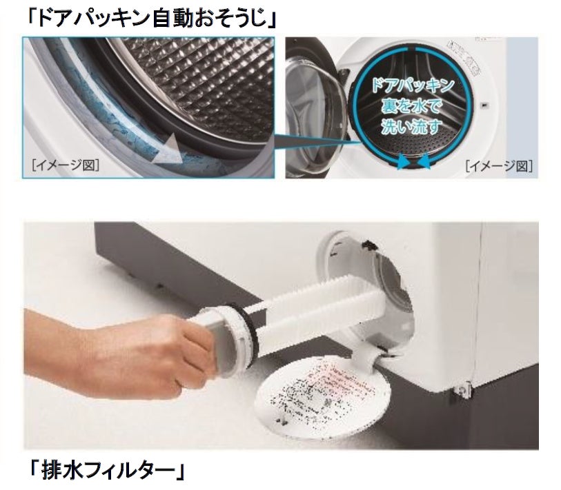 洗濯運転前と乾燥運転中にシャワー水とゴムワイパーで糸くず・ホコリを自動でおそうじするから、面倒な乾燥フィルターのお手入れを軽減。洗濯のたびに洗濯槽の裏側も除菌(※3)&黒カビを抑制(※4)する「カビケア槽自動おそうじ」(※5)や、ドラム内を乾燥して黒カビの原因となる水分を取り除く「槽乾燥コース」、パッキンの溝深くに残った糸くずや洗剤の泡を水で洗い流す「ドアパッキン自動おそうじ」など、手間のかかるお手入れをおまかせできる便利な機能が備わっています。