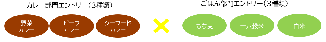 対象は、もち麦、十六穀ごはん、白米の主食3つと、野菜カレー、ビーフカレー、シーフードカレーのカレー3種。5つの基本味「甘味」「旨味」「塩味」「酸味」「苦味」+「コク」に分解して数値化し、味の相性を科学的に分析しました。