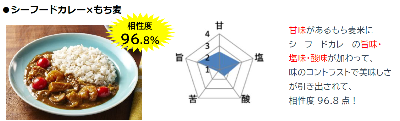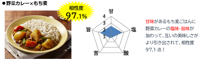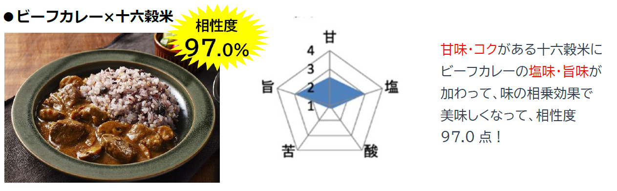 検証の結果、雑穀は全て白米より相性度が高く、さらに「非常に相性がいい」とされる95%以上を獲得。