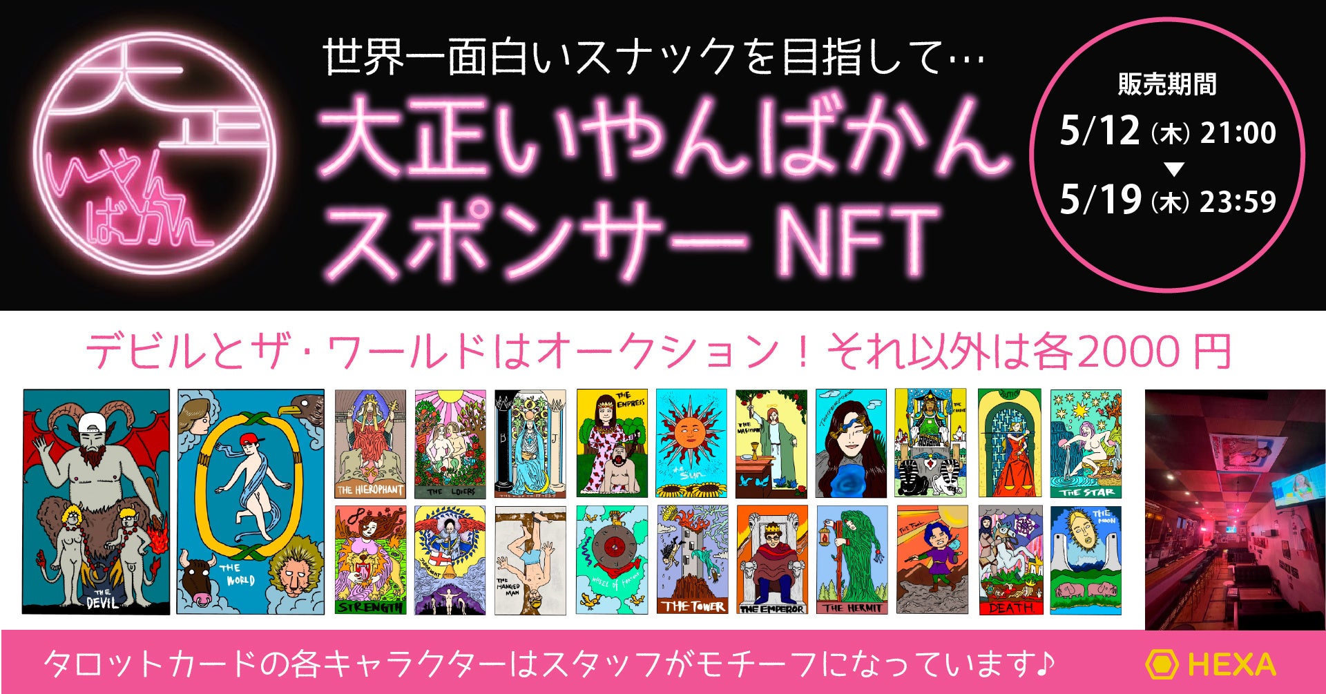 NFTマーケット「HEXA(ヘキサ)」では、大阪府のスナック「大正いやんばかん」がスタッフをモチーフにしたタロットカード型のスポンサーNFTを5/12(木)から販売します。