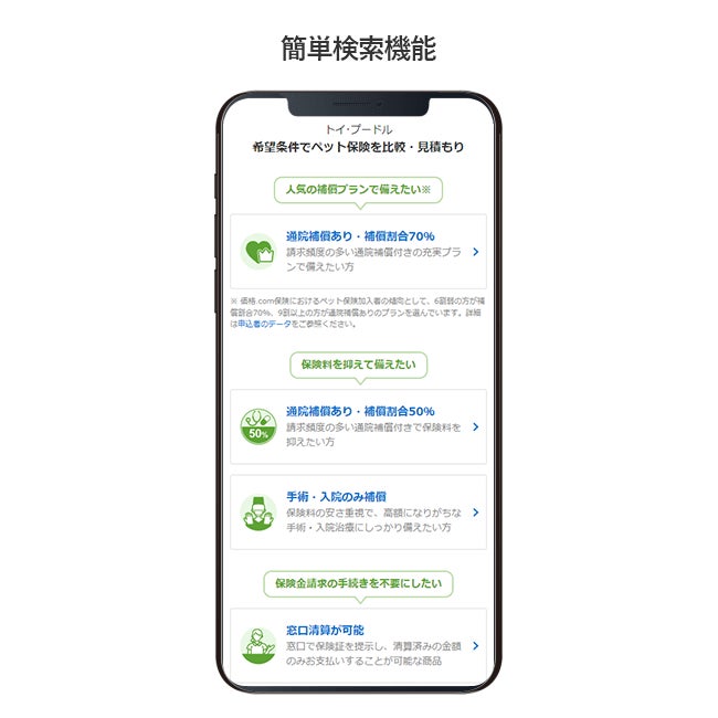 お客さまのニーズに合ったペット保険を簡単な操作で表示できる検索機能(※3)を追加しました。「人気の補償プランで備えたい」方には「通院補償あり・補償割合70%」の商品をご提案します。(※4)そのほか「保険料を抑えて備えたい」方には「通院補償あり・補償割合50%」とした商品や「手術・入院のみ補償」する商品のご提案。「動物病院の窓口で、保険金の精算を完了したい」方には、窓口精算(※5)が可能な商品をご提案します。